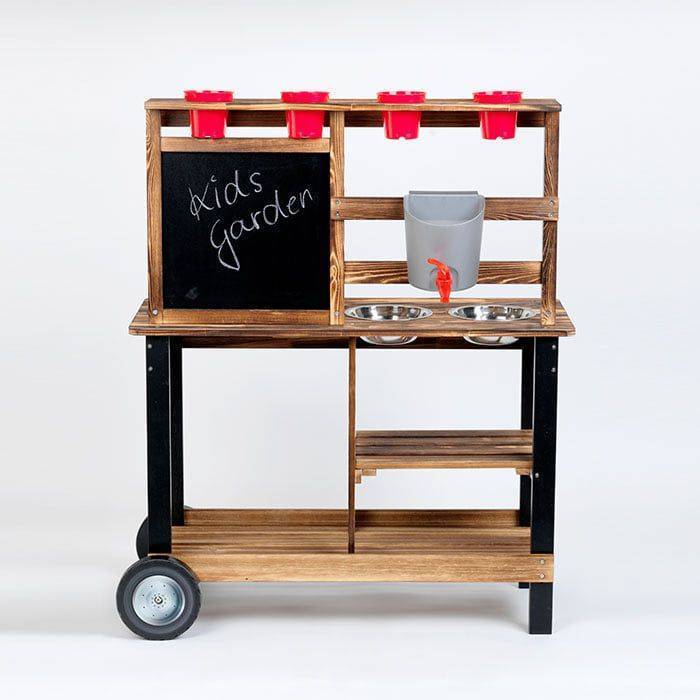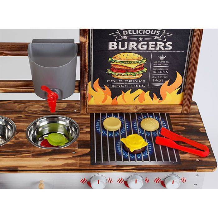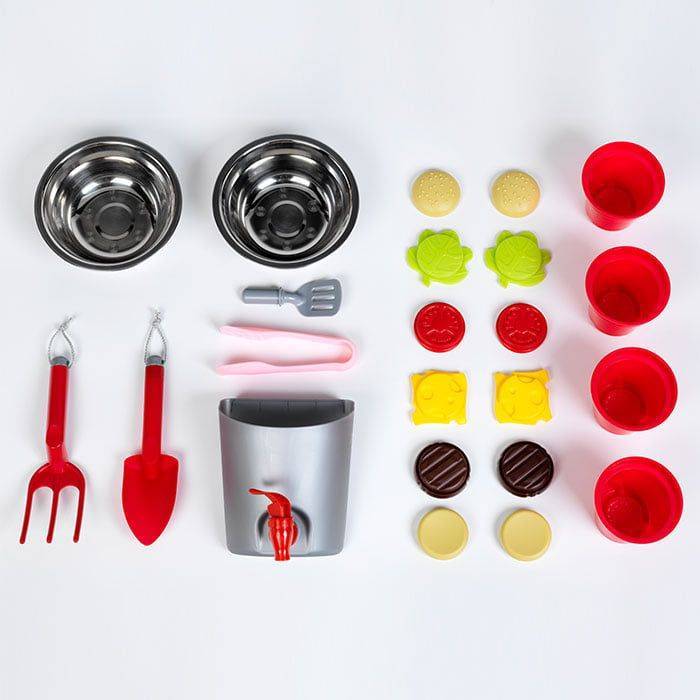 With grill surface and spatula, two Hamburgers, two sinks, plant pots, shovel, rake and removable water tank with tap for planting and muddy.